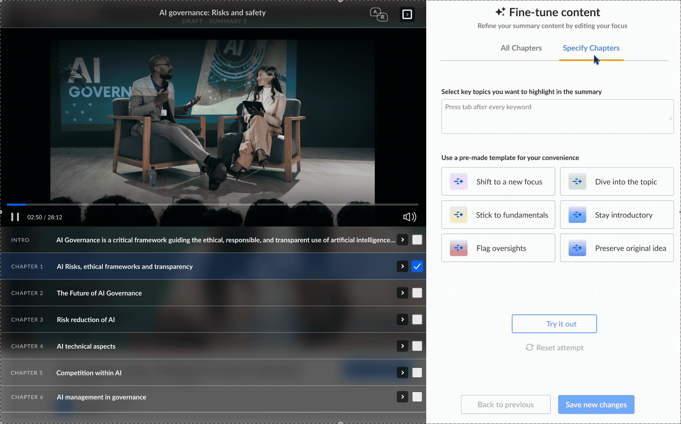 Tune the summary’s content across all or selected chapters with customized keywords or pre-made templates.